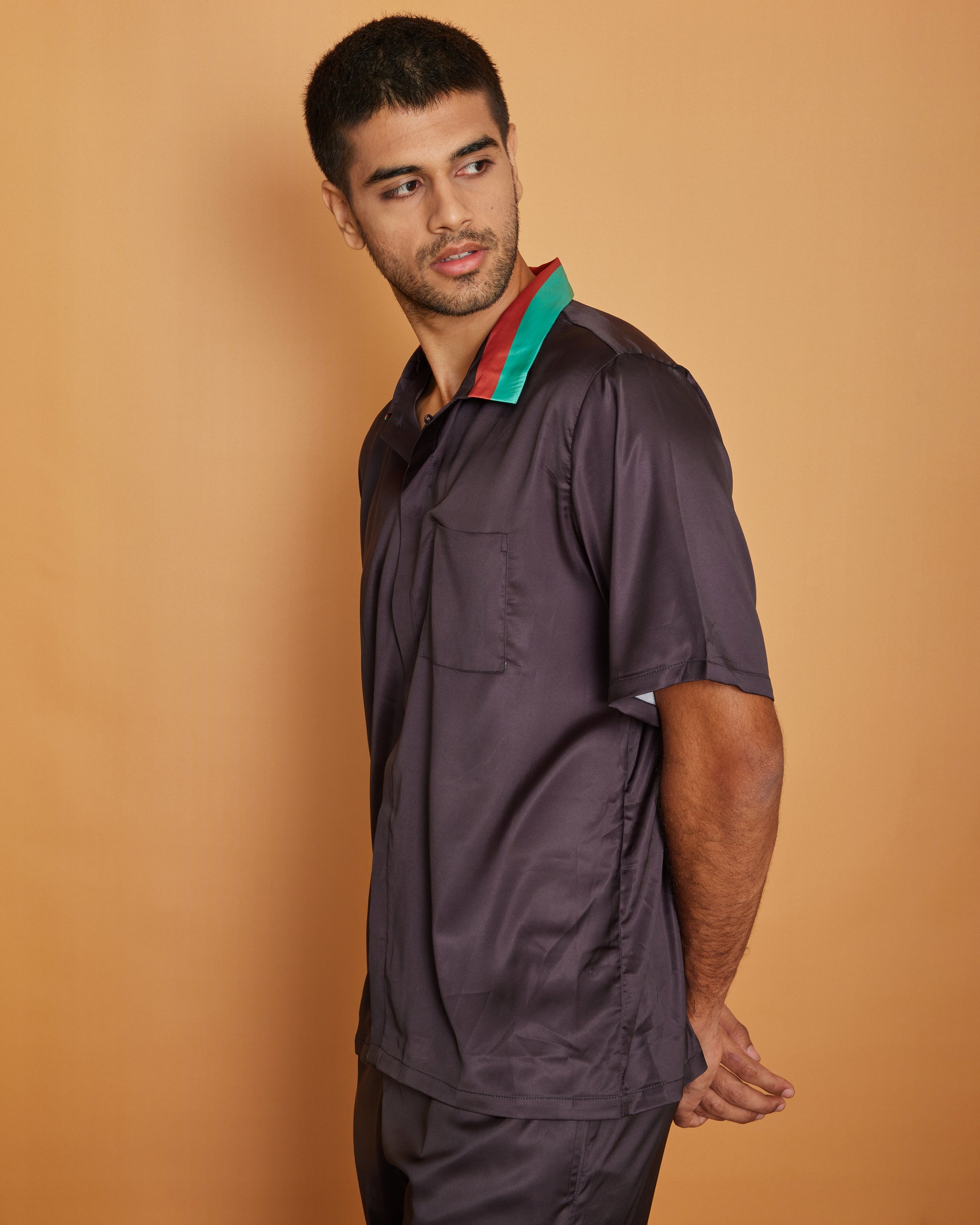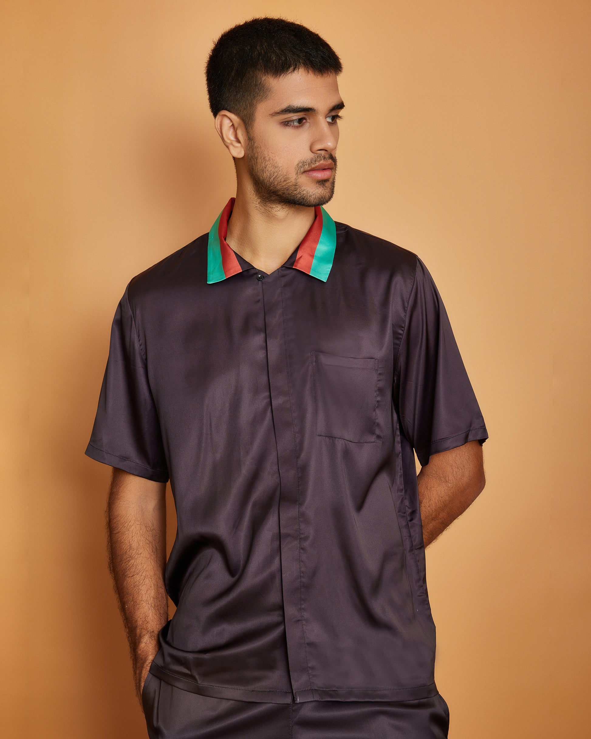 Strong linear elements meet fluid satin fabric, resulting in a shirt that feels confident, architectural, and unmistakably bold.