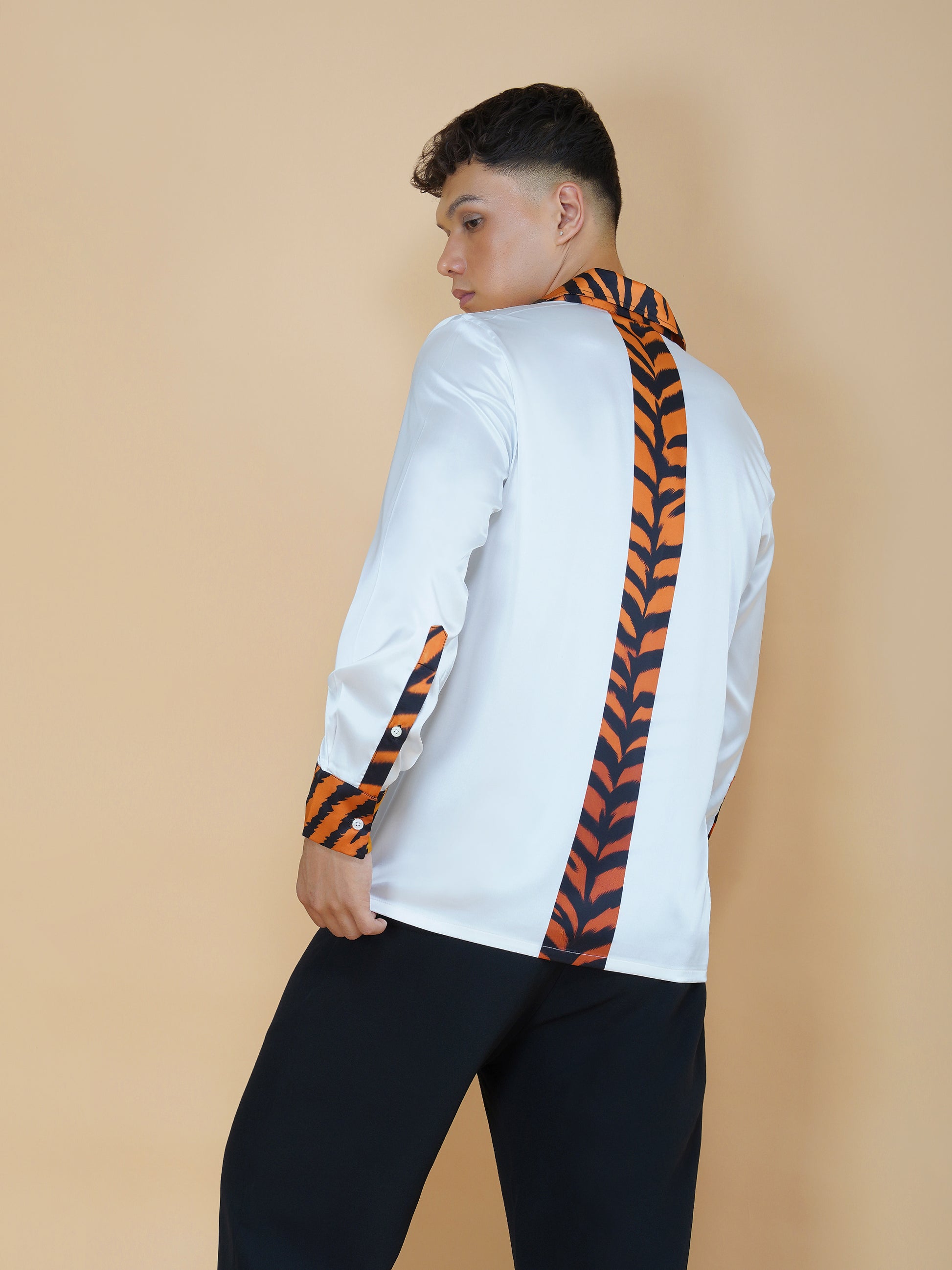 The Feral Luxe shirt features a powerful full-length tiger artwork paired with contrasting striped accents across the collar, cuffs, and back. Every placement is intentional — bold, confident, and unmistakably Club Havana.