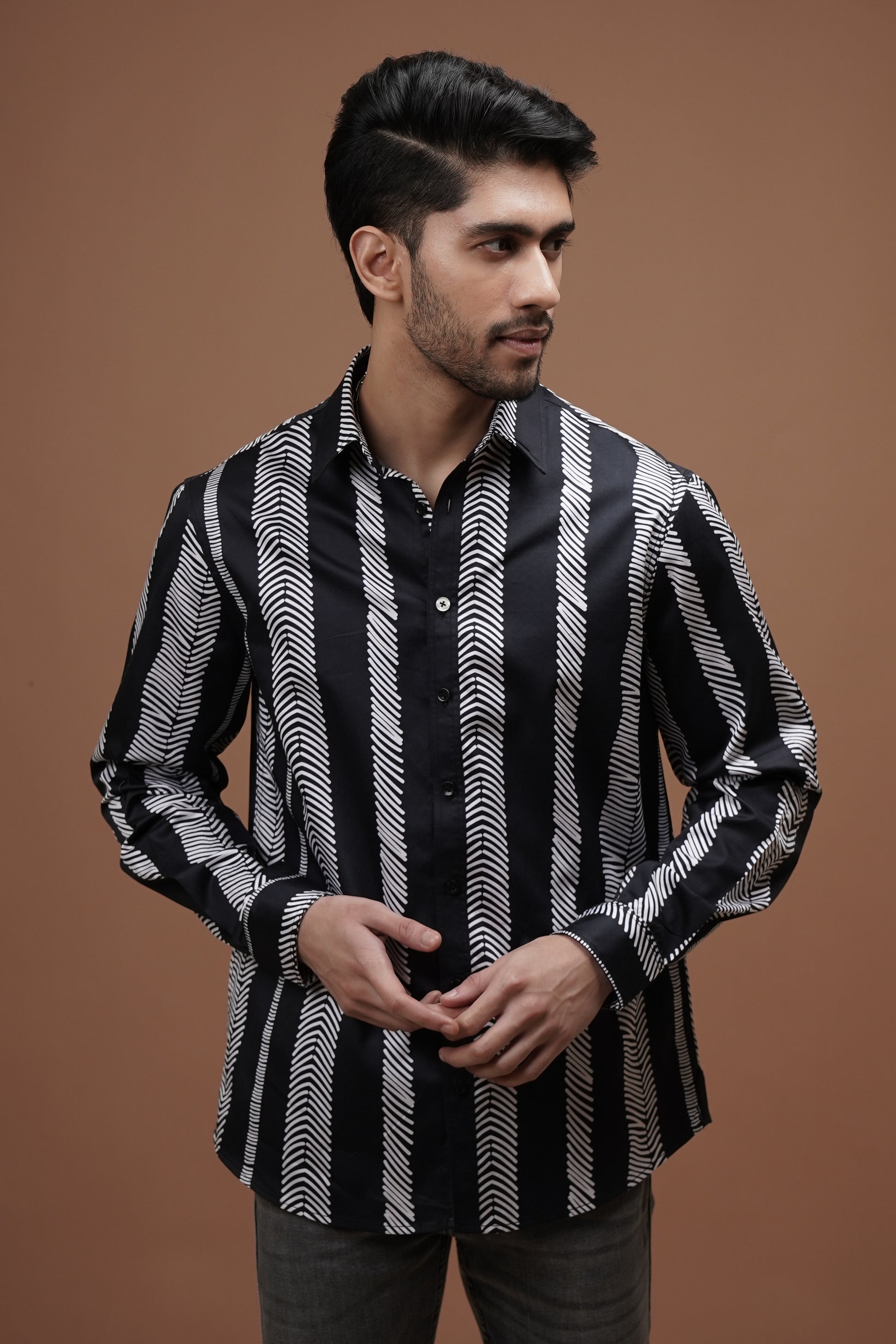 "Elevate your party look with the Midnight Lines shirt, featuring sleek, abstract white vertical stripes running down a bold black base. Made from premium cotton, this unique party wear shirt for men is perfect for those who prefer a sharp, sophisticated style for night events or social gatherings."