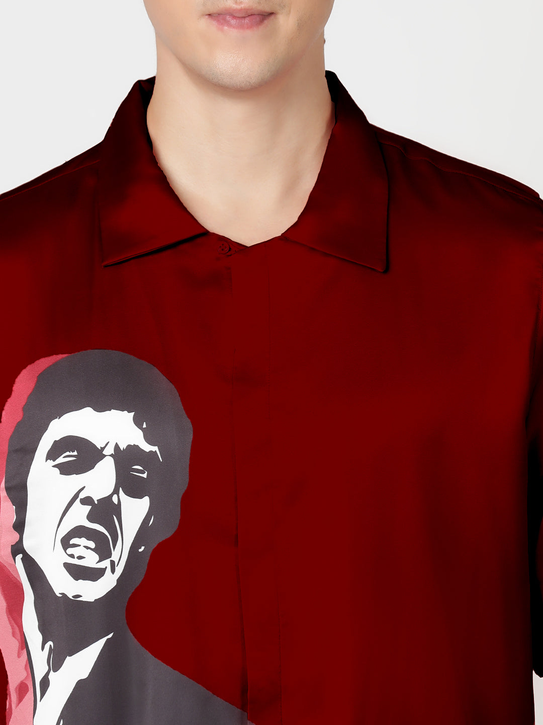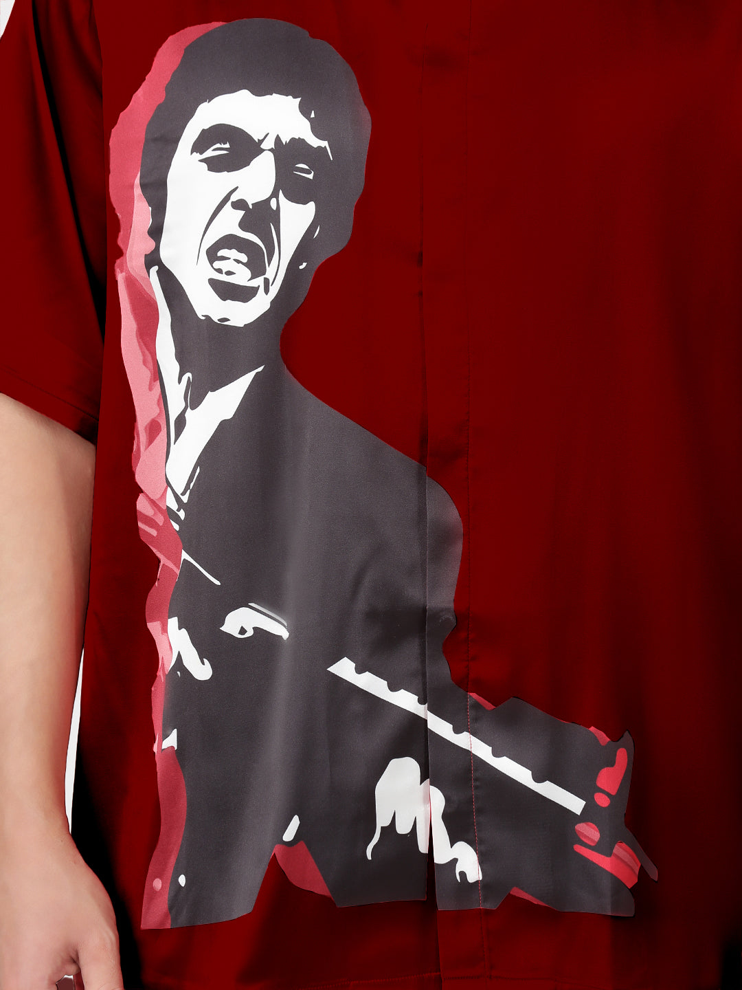 Step into the world of 'SCARFACE' with the 'Red Menace' Shirt. Showcasing actor Al Pacino in a powerful pose, this shirt combines vintage Hollywood allure with a bold red and white design. Perfect for stylish casual night party outfits for guys.