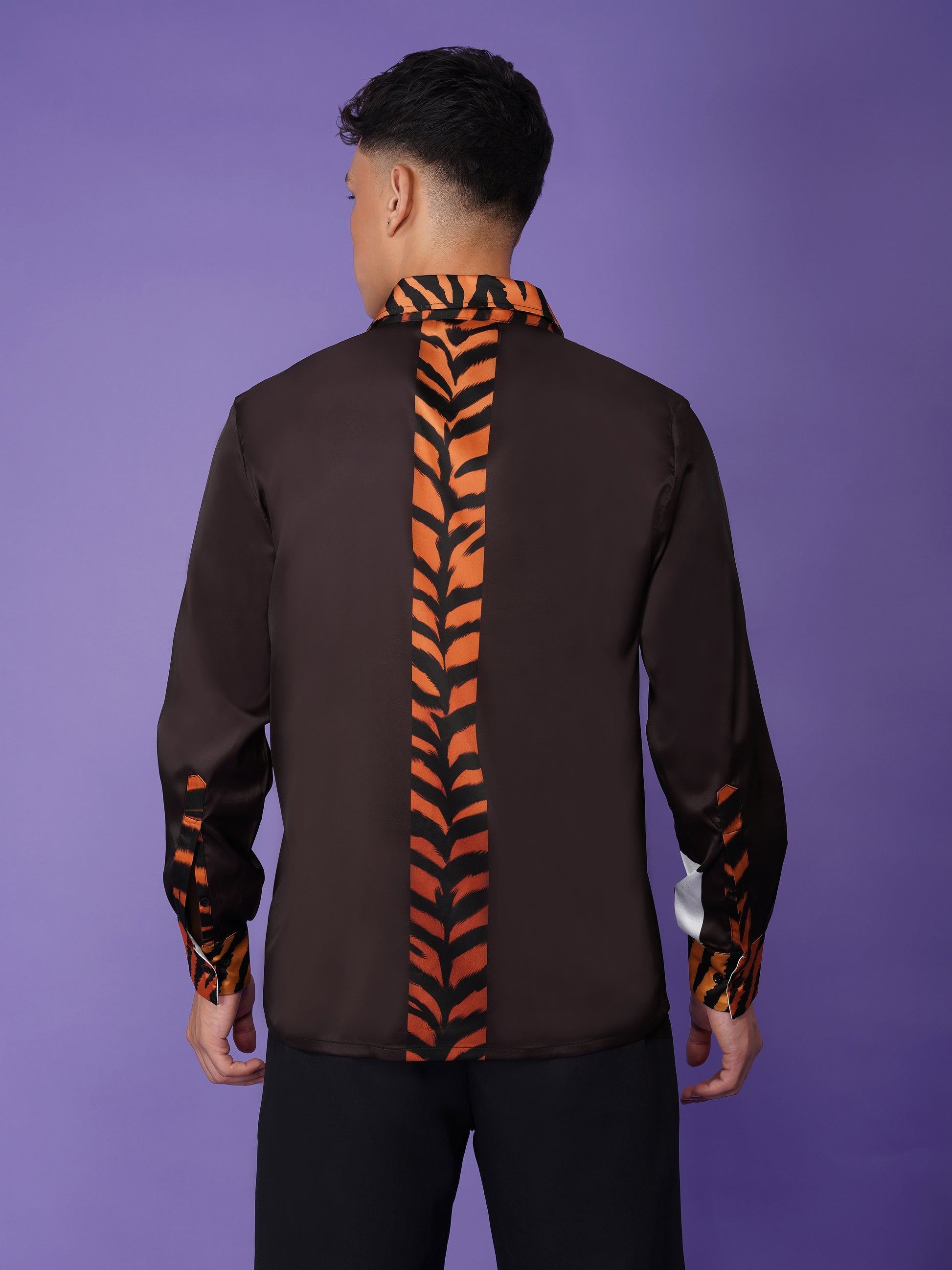 "Unleash your wild side with the Striped Majesty shirt, featuring a striking full-length tiger, subtle pocket area detail, and bold tiger stripes across the collar, sleeves, and back. A premium men’s party wear piece that radiates untamed luxury."